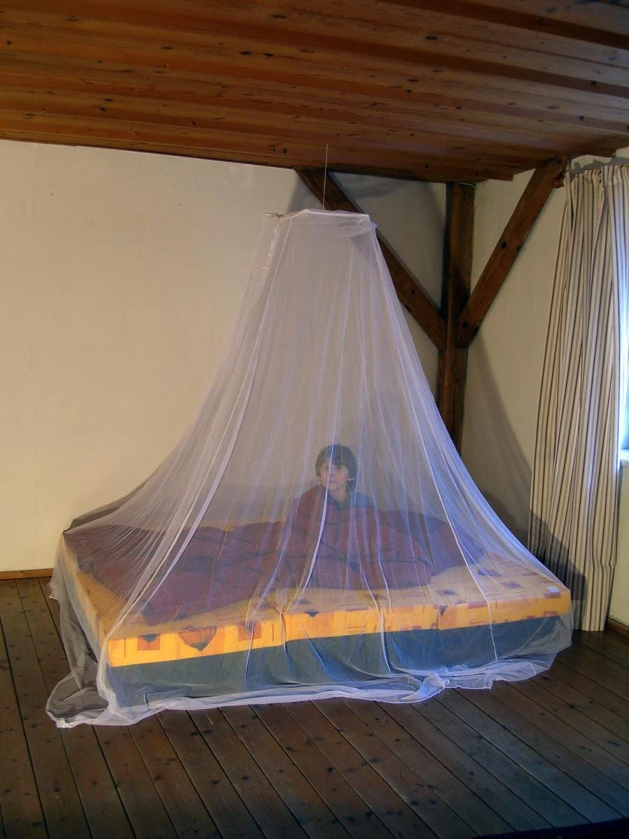 Baldachinförmige Moskitonetze aus Polyester in zwei Größen: für Einzelbetten und schmale Doppelbetten bzw. für große Doppelbetten oder zwei aneinander gestellte Einzelbetten.