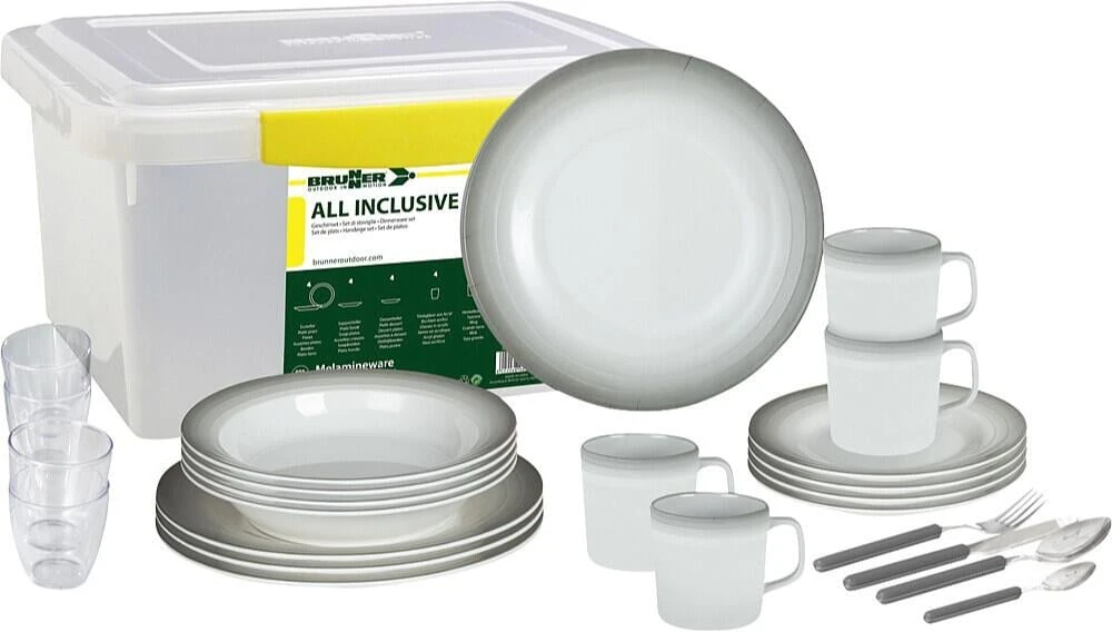 Praktisches All-in-One Set aus der Astralys-Serie. Elegantes Geschirrset hergestellt aus robustem Melamin, verbindet Design und Funktionalität. Das Geschirr ist bruch- und kratzfest und mit Anti-Slip Ring ausgestattet. Das Set beinhaltet 4 große Essteller, 4 Suppenteller, 4 Desserttreller, 4 Henkelbecher, 4 Trinkgläser, ein 16-teiliges Besteckset und eine praktische Transportbox.