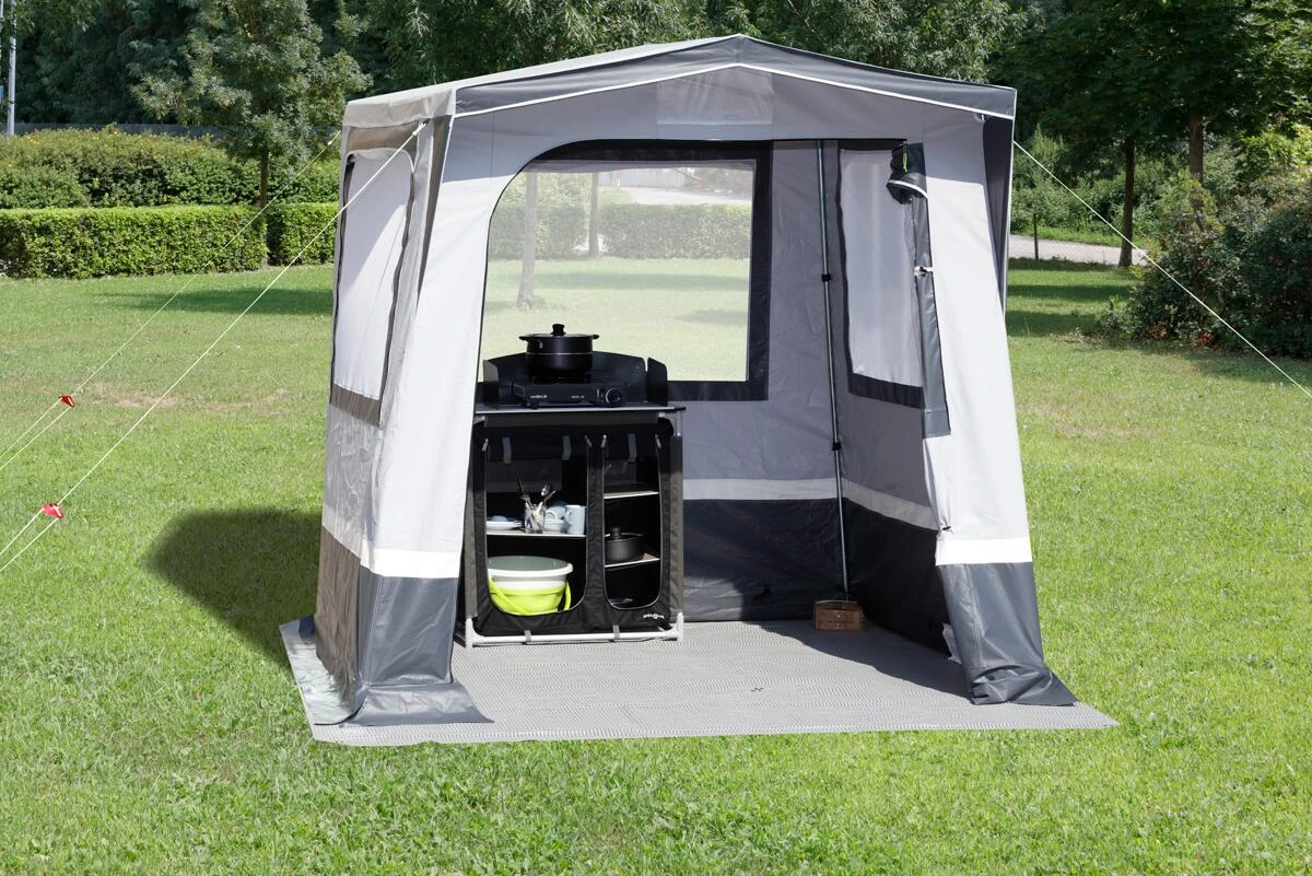 Neu entwickeltes Multifunktionszelt. Dient perfekt als Küchen- und Gerätezelt zum Schutz aller Gegenstände, die nicht im Freien gelassen werden können. Die gesamte Zelthaut besteht aus PVC und wird von einem stabilen Stahlgestell getragen. Drei große Fenster mit Mosquitogaze und einer effizienten Hochentlüftung sorgen für eine optimale Dauerbelüftung. Mit breiter Eingangstür, die seitlich aufgerollt werden kann. Mit Rundum-Schmutzstreifen.