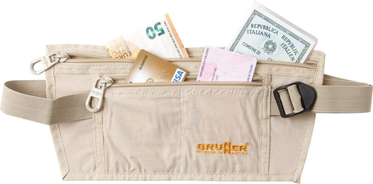 Zwei Außentaschen mit Reißverschluss. Verstellbarer Hüftgurt. Rückenteil aus hautfreundlichem Gewebe.