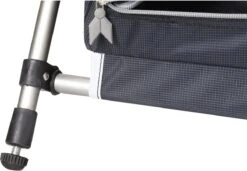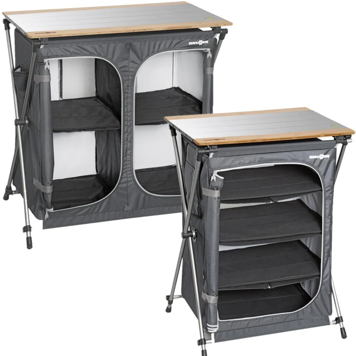 Ultraleichter Faltschrank mit stabilem Alu-Steckgestell und eleganter, rollbarer Abdeckplatte aus Aluminium mit Bambus- Abschlussleisten. Der geräumige Schrank mit heller Innenbeschichtung bietet viel Stauraum für Lebensmittel, Geschirr und allerlei Gegenstände des Camperlebens. Alle 4 Beine sind höhenverstellbar.