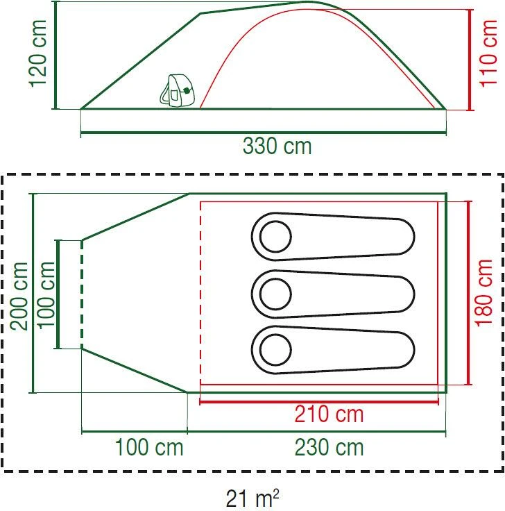 - Maße innen (B x T x H): 180 x 210 x 110 cm