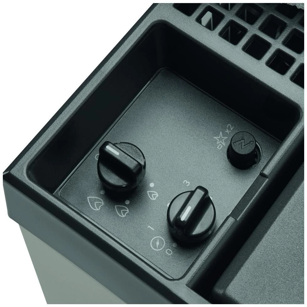 - Dreistufige Regulierung der Flamme bei Gasbetrieb, Thermostatregulierung im 230 V-Betrieb