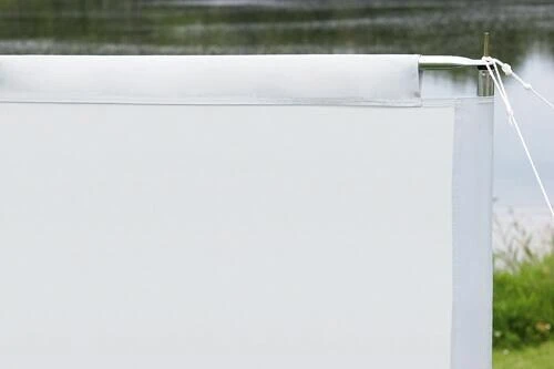 Die Außenstangen werden durch feste Hohlsäume geführt, die 2 inneren Stäbe mit Klettbändern am Gewebe befestigt. Die waagrechten Spannstäbe werden durch Hohlsäume geführt und verleihen dem Windschutz Stabilität.