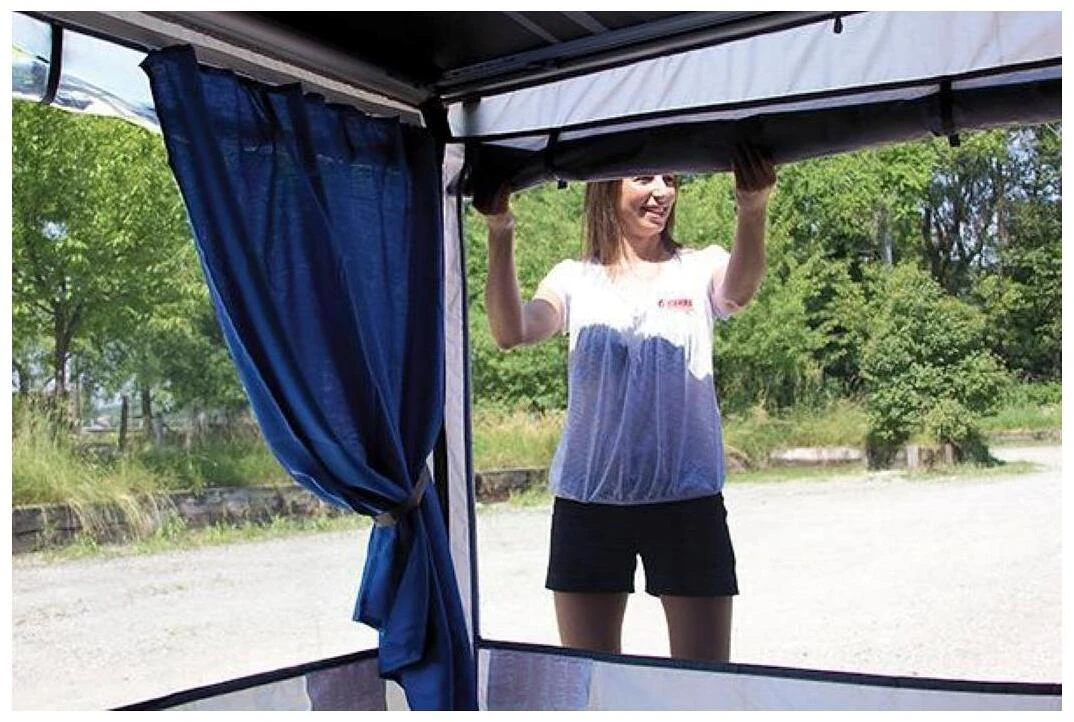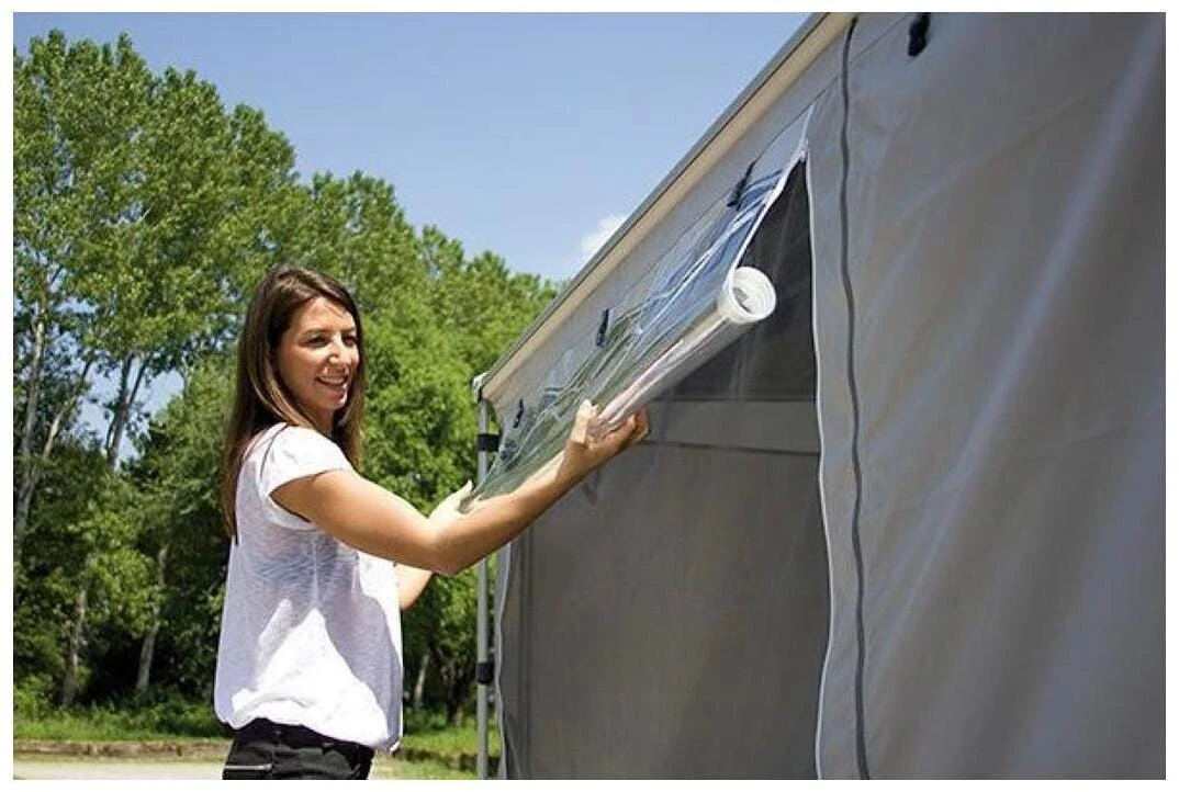 - Frontwand mit aufrollbarem Crystal-Fenster und serienmĂ€Ăigem Moskitonetz und VorhĂ€ngen, Aufrollbare TĂŒr
