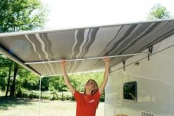 Spannstange, um das Markisentuch in Spannung zu halten. Dadurch läuft das Wasser leichter ab. Aus solidem Aluminium, serienmäßig mit Wandhalterung zur Aufbewahrung im Fahrzeug.