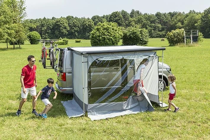 Das ideale Vorzelt in Verbindung mit der F40van Markise für kurze Aufenthalte. Eine einfache, leichte und effiziente Lösung, um so Ihre Privatsphäre bei kurzen Ausflügen zu erhöhen. Wird ohne jegliches Gestänge an die Schiene der Frontblende und an die Schiene des Gehäusekastens der F40van angebracht. Leicht und dennoch resistent dank dem Ripstop Material. Nimmt in der mitgelieferten Tasche Mega Bag wenig Platz ein.