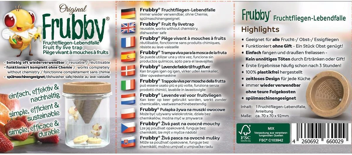 FrubbyÂź ist die erste 100% nachhaltig hergestellte Fruchtfliegen-Lebendfalle. Ab jetzt fangen Sie Fruchtfliegen zuverlĂ€ssig und ohne den Einsatz von chemischen Lockmitteln. Fruchtfliegen werden einfach eingefangen und drauĂen freigelassen – ohne unnötiges Töten durch ErtrĂ€nken oder Gift! Erste Ergebnisse sieht man hĂ€ufig schon nach wenigen Stunden (je nach Befall & Reifegrad des verwendeten Obstes).