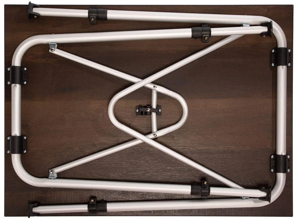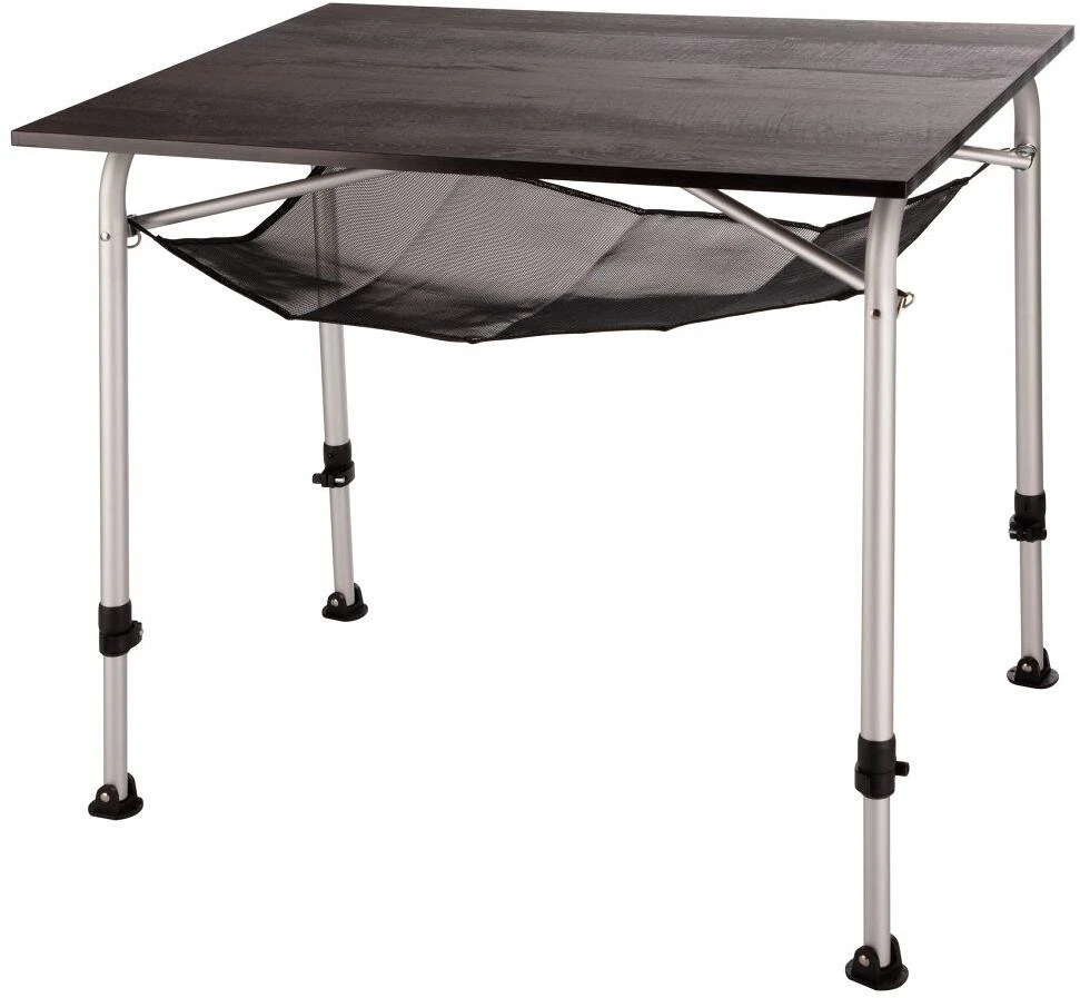 Klassischer Camping Klapptisch mit stabiler Tischplatte. Alle 4 Beine sind mittels einer stufenlosen Verstellung von 59 bis 72 cm stabil einstellbar. Wetterfeste Tischplatte inklusive Ablagenetz und Bodennägel.