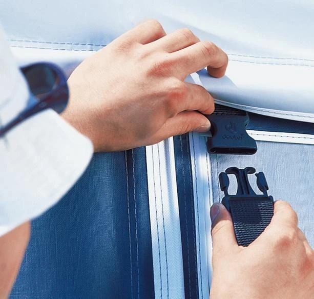 Sicherer Stand bei Wind und Wetter. Mit Mittelband. Sicher ist sicher! Dieses extrem robuste Abspannband sichert Ihr Zelt bei starkem Wind. Das innovative Sturmband wird an den Seiten der Vorderwand eingeclipst, ohne das seitliche Vordachgestänge zu belasten. Einfacher und effektiver kann eine innovative Abspannung nicht mehr sein. Durch den Einsatz einer zusätzlichen Feder, wird die Zugbelastung auf Gurt und Zelt deutlich gedämpft. Eine lohnende Investition in die Sicherheit Ihres Zeltes.