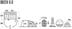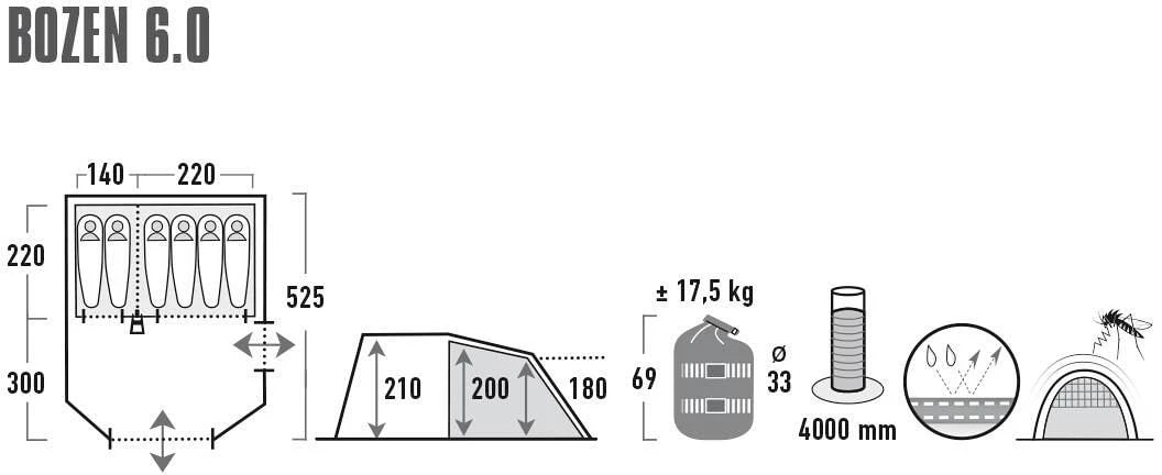 Das Bozen 6.0 bietet für 6 Personen mit Camping Ausrüstung ausreichend Platz. Bestens geeignet für einen erholsamen Familienurlaub. Familien- Tunnelzelt mit eingenähtem Boden hält Feuchtigkeit, Schmutz und Krabbeltiere aus dem Zelt. Der Wohnraum in 2,1m Stehhöhe bietet Platz für Camping Ausrüstung. 2 Gazeeingänge und 2 Dauerventilationen belüften den Wohnbereich und halten lästige Insekten fern. 4 Panorama Klarsichtfolienfenster durchfluten den Wohnbereich. Gardinen schützen vor neugierigen Blicken. Das Dach hat eine Aluminium- Beschichtung und ist Hitze reflektierend. Die High Peak 3- Stufen “Dual Flow“ Ventilation“ im Schlafbereich passt sich jeder Wettersituation optimal an.