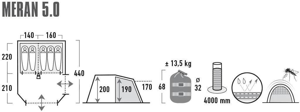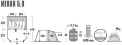Extra starke Reißverschlüsse. Die Reißverschluss Abdeckung ist mit einer zusätzlichen Regenrinne ausgestattet. Die Regenrinne schützt zusätzlich gegen Eindringen von Nässe. Die sehr stabilen 5mm Stahl- Erdnägel verbiegen sich auch bei hartem Untergrund nicht. Die Nähte sind mittels Nahtband wasserdicht versiegelt und gewähren eine bessere Naht- Reißfestigkeit. Kabeleingang mittels Reißverschluss und Kabelführung für Beleuchtung. Abgedunkeltes Innenzelt mit Vario Vent Control System. 2 Moskitonetz- Eingänge halten lästige Plagegeister fern und können bequem von innen je nach Klima variabel bedient werden. Mit einer Reißschluss- Trennwand lässt sich das Innenzelt in eine große Kabine oder 2 Schlafbereiche aufteilten. 5 Praktische Organizer und 5 Innenzelttaschen für Utensilien. 2 Lampenhalter für Campingleuchten runden den Komfort ab. Das Meran 5.0 bietet für bis zu 5 Personen mit Camping Ausrüstung ausreichend Platz. Kompaktes Außenmaß und schneller Aufbau. Bestens geeignet für Camping Urlaub und Wochenend- Camping am See.