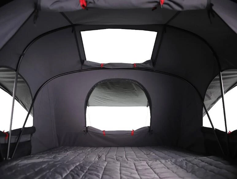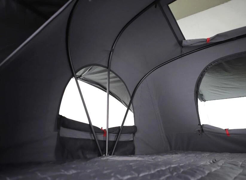 Der neue dunkelgraue Canvas verschmilzt mit dem schwarzen Tropendach zu einem zeitlosem Design. In geöffnetem Zustand ist das Zelt 307 x 287 cm groĂ und hat eine SchlafflĂ€che von 227 x 175 cm. Die Aluminium-Bodenplatte lĂ€sst sich zu einer riesigen King-Size-FlĂ€che ausklappen und die superbequeme und dicke Premium-Matratze sorgt fĂŒr angenehmen Schlaf. Um die Aussicht aus luftiger Höhe zu genieĂen, verfĂŒgt das X-Cover Dachzelt rundherum ĂŒber groĂe Fenster. Das neue, gebogene Fenster-Design ermöglicht es, die RegenĂŒberdachung einfach vom inneren des X-Covers zu spannen und aufzustellen. Alle sind mit einem sehr feinen, robusten Mosquitonetz, einem von innen verschlieĂbaren Wetterschutz und speziellen Ăberdachungen, die das DurchlĂŒften auch bei starkem Regen ermöglichen, ausgestattet. Einzigartig sind die 2 Panorama-Dachfenster, die nachts den Blick auf die Sterne ermöglichen oder tagsĂŒber das Zelt erhellen. FĂŒr LangschlĂ€fer verfĂŒgen die Dachfenster selbstverstĂ€ndlich ĂŒber eine von innen verschlieĂbare Stofflage.