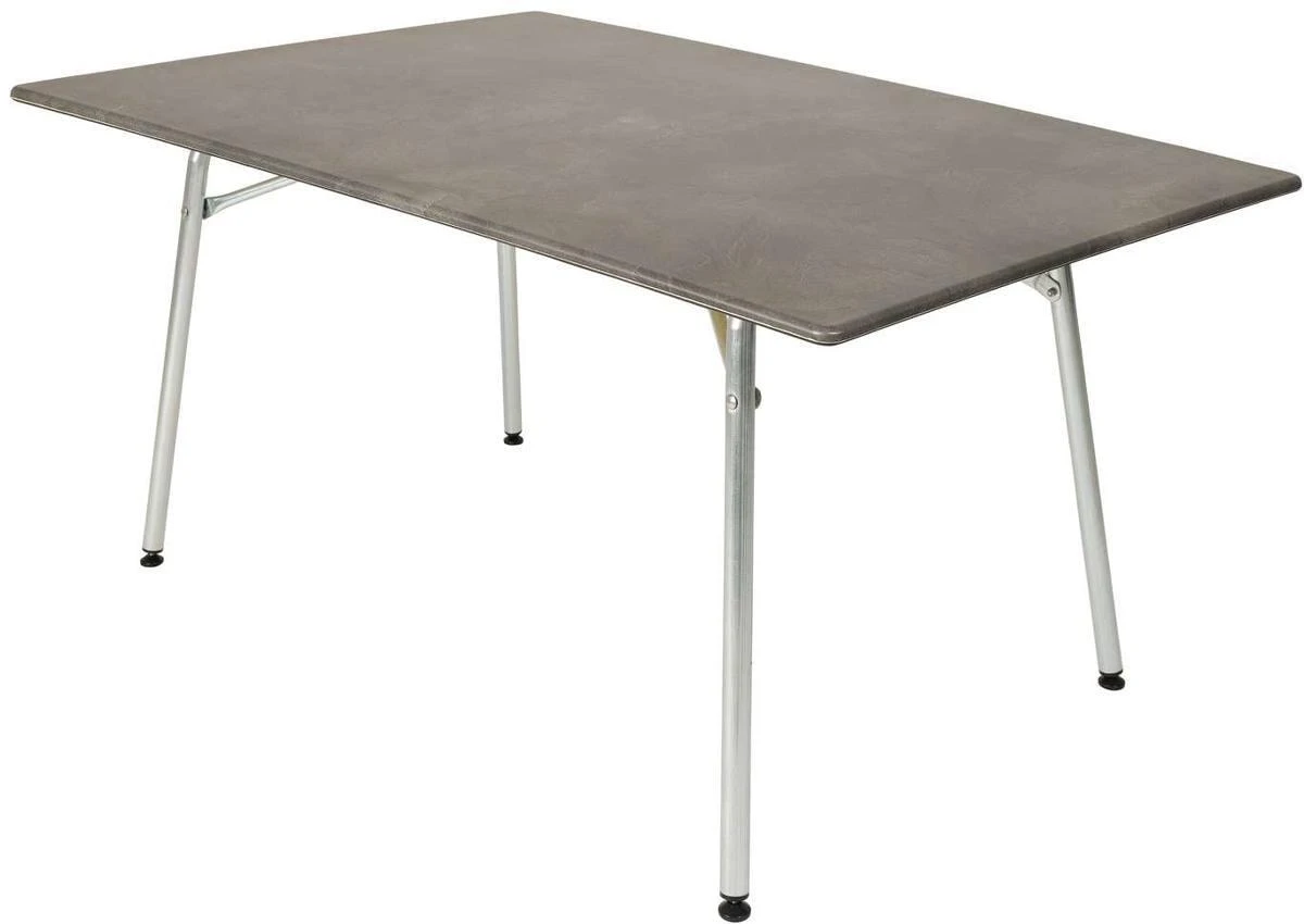 Dieser stabile Esstisch lässt keine Wünsche an Stabilität und Belastbarkeit offen. Der Tisch zeigt sich stilecht mit abgerundeten Ecken und Kanten und mit leicht gewinkelten Tischbeinen. Die vier Tischbeine sind in Höhe und Neigung verstellbar, wodurch Unebenheiten kein Problem mehr sind. Das Untergestell aus Stahl ist zusammenklappbar und so ist der Tisch zum Transport nur 6 cm dick. Die Tischplatte hat keine umlaufenden Kanten, so dass Wasser und Schmutz einfach ablaufen kann und die Reinigung sehr einfach wird. Das Plattenmaterial ist UV-beständig, voll wetterfest, bruch- und schlagfest, zigarettenglutfest und hitzebeständig bis zu 180°C. Widerstandsfähiger kann eine Tischplatte kaum sein!