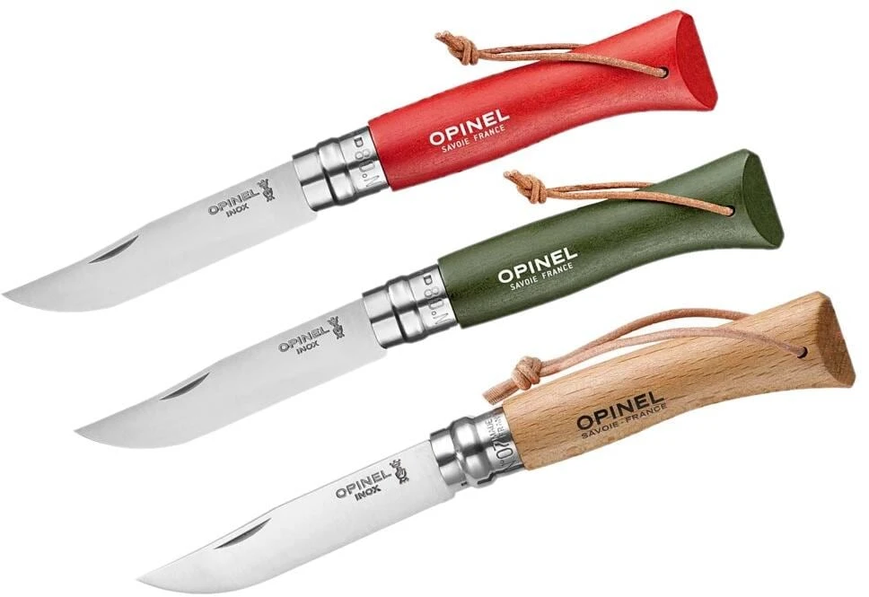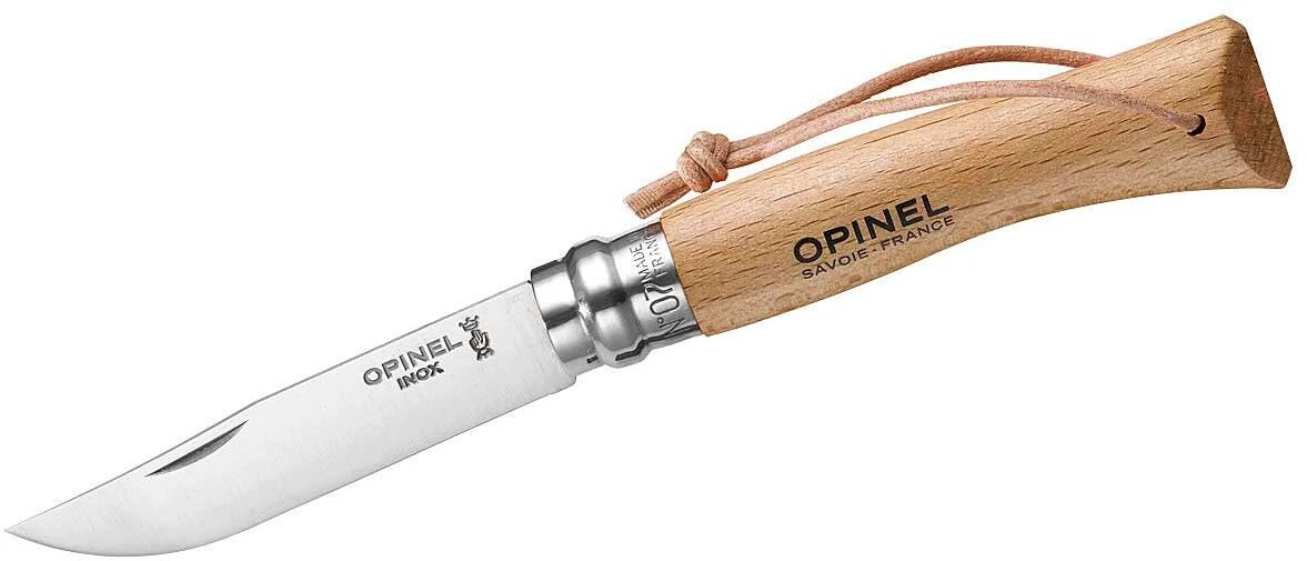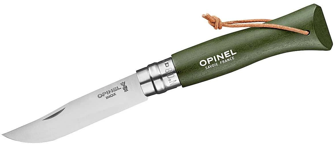Opinel-Messer welches als Grundlage ein reguläres Modell No. 08 mit rostfreier Klinge aus modifiziertem 12C27 Sandvik-Stahl hat. Das Virobloc-System sichert die Klinge vor ungewolltem Öffnen und Einklappen bei der Arbeit. Zum Befestigen an Gürtel, Schlüsselbund oder auch einem Karabiner ist am Griff aus Buchenholz eine Lederkordel angebracht.