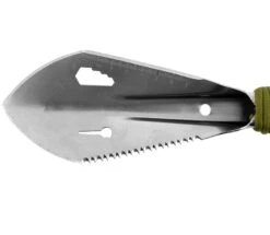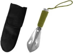 Die kleine und handliche Schaufel ist ein äußerst praktischer Begleiter bei kleineren Trekkingtouren durch die Natur. Mit über 7 Funktionen kann die Schaufel sehr vielseitig eingesetzt werden. Die Funktionen sind: Schaufel, Nagelzieher, Messer, Säge, Schraubenschlüssel und Lineal. Gefertigt aus hochwertigem Messer Edelstahl ist die Schaufel sehr beständig gegen Rost. Der Griff ist mit einem 3 Meter langen und für Notsituationen sehr nützlichen Paracord umwickelt. Mit praktischer Handschlaufe und im Lieferumfang enthaltener Nylontasche.