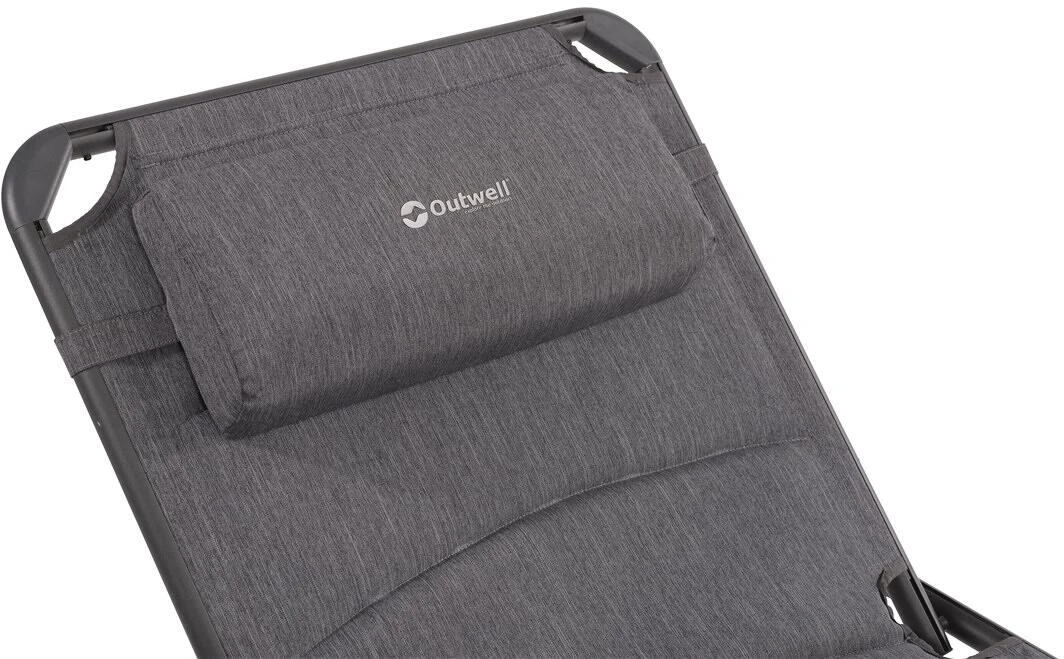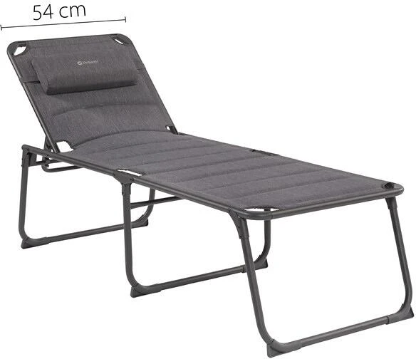 Gepolsterte SitzflĂ€che und RĂŒckenlehne aus Polyester mit fĂŒnf Verstellmöglichkeiten fĂŒr optimalen Komfort. Besitzt eine maximale Tragkraft von 120 kg dank des leichten, hochfesten, pulverbeschichteten Aluminiumrahmens mit integriertem, abnehmbarem Nackenkissen