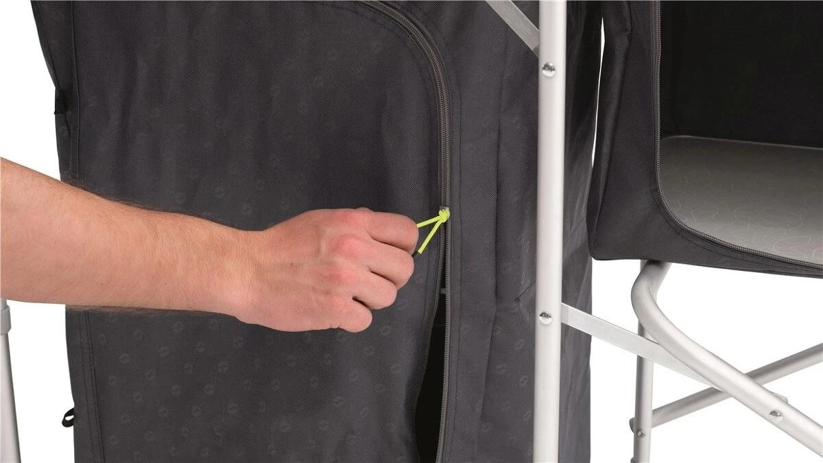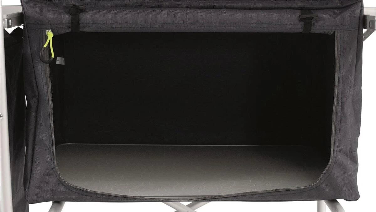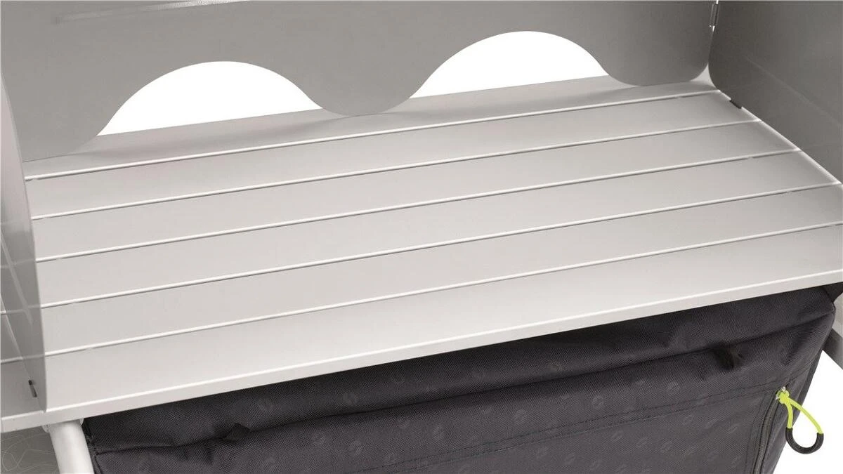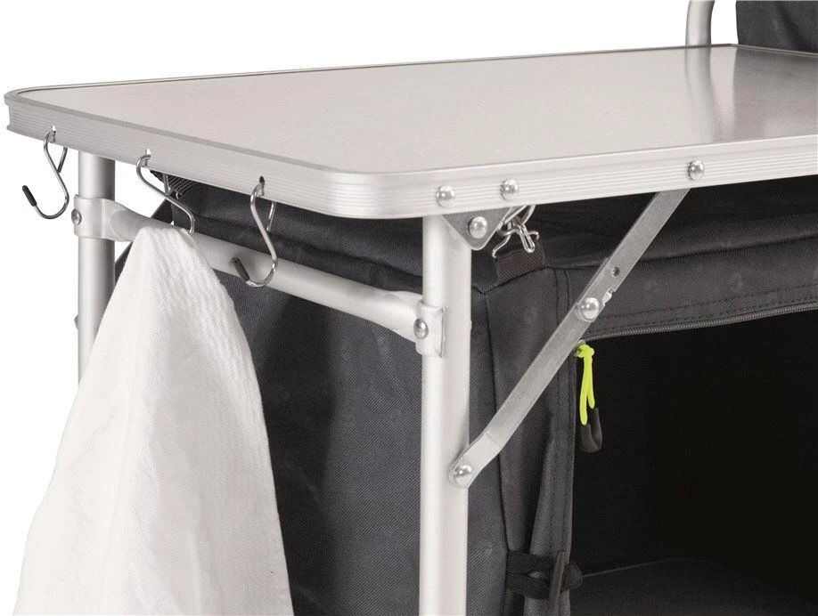 Einfach zu bedienende, leichte Kücheneinheit aus Aluminium. Sie bietet den von einer Familie benötigten Schrank- und Arbeitsraum für die Aufbewahrung und Zubereitung von Speisen in einem kompakten Paket für den bequemen Transport.