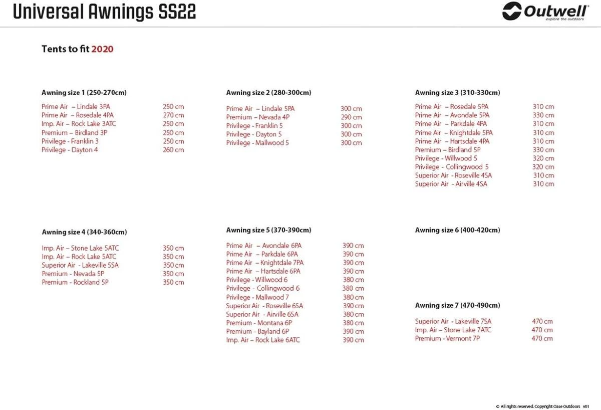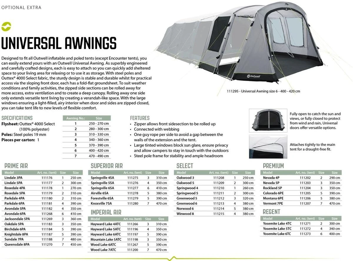 Das Outwell Universal Vorbau ist fĂŒr alle aufblasbaren Zelte und GestĂ€nge-Zelte von Outwell (auĂer Encounter-Zelte) geeignet und kann diese auf einfache Weise erweitern. Jedes der hervorragend konstruierten und sorgfĂ€ltig gefertigten Designs lĂ€sst sich leicht anbringen, so dass man den Wohnbereich schnell um einen geschĂŒtzten Raum zum Entspannen oder als Stauraum erweitern können. Die robuste Konstruktion mit Stahlstangen und OuttexÂź 4000 Select-Gewebe ist stabil und langlebig, und fĂŒr einen praktischen Zugang ĂŒber die schrĂ€ge VordertĂŒr verfĂŒgt jedes Zelt ĂŒber eine flach faltbare Bodenplane. Je nach Wetterlage und FamilienaktivitĂ€ten können die Seitenteile mit ReiĂverschluss aufgerollt werden, um den Zugang zu erleichtern, die BelĂŒftung zu verbessern und ein tiefes Vordach zu schaffen. Rollt man nur eine Seite weg, so entsteht ein verandaĂ€hnlicher Raum, der das Leben im Zelt vielseitiger macht. GroĂe Fenster sorgen fĂŒr einen lichtdurchfluteten, luftigen Innenraum, wenn TĂŒr und SeitenwĂ€nde geschlossen sind, was Ihr Zeltleben auf ein neues Komfortniveau erhebt.