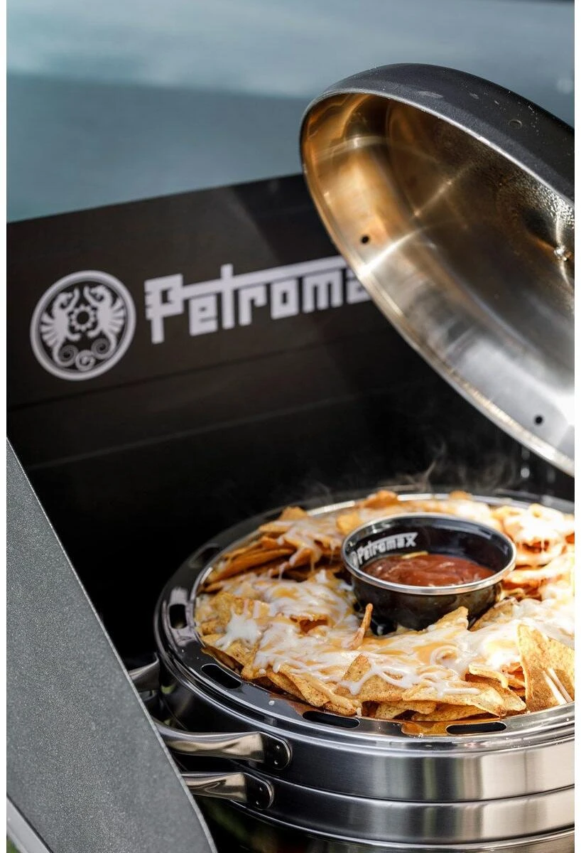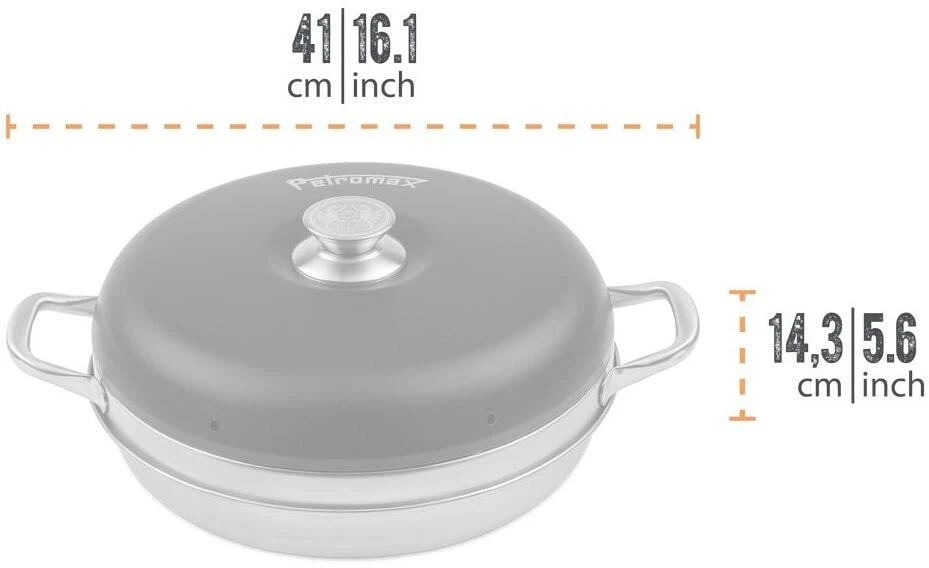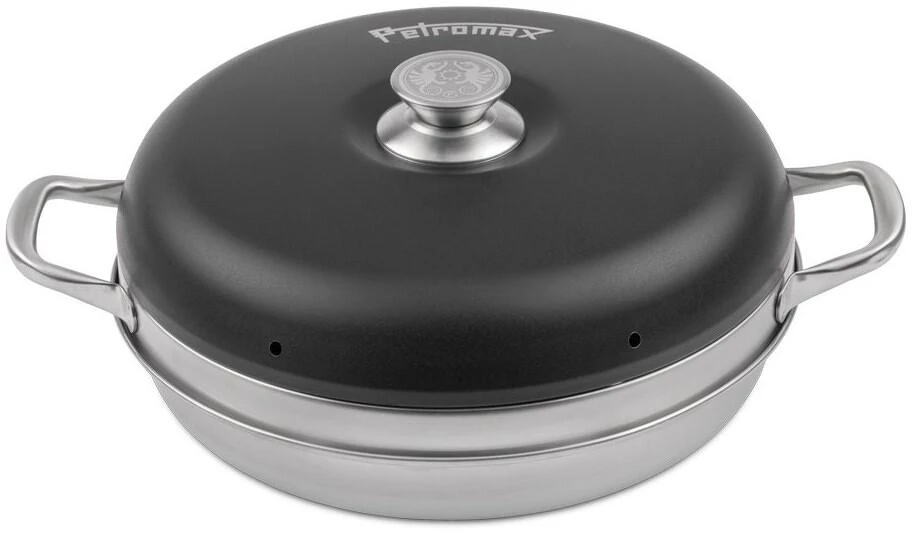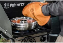 Der Petromax Camping Backofen versorgt alle überall mit frischen Gemüse-Aufläufen, Frühstücksbrötchen oder Speckkuchen dank seiner Rundumwärme. Hitze vom Gastisch, Camp-Kocher oder der Glut steigt von der Basisform auf in die Ringform und gart dort Auflauf oder Ofengemüse. Unter dem aufgesetzten Deckel kann sich die Hitze optimal verteilen. Eine hervorragende Luftzirkulation kommt durch die clevere Konstruktion zustande: Ventilationsöffnungen und die äußere Beschichtung ermöglichen dir optimale Backergebnisse bei ganz viel Unabhängigkeit!