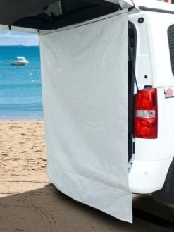 Der Sichtschutz kann mit und ohne Heckzelt eingesetzt werden (kein dichter Abschluss). Einfach mit dem verstellbarem Gurt über der Heckklappe befestigen und bei Bedarf am Stoßfänger mit Kunststoffhaken fixieren.
