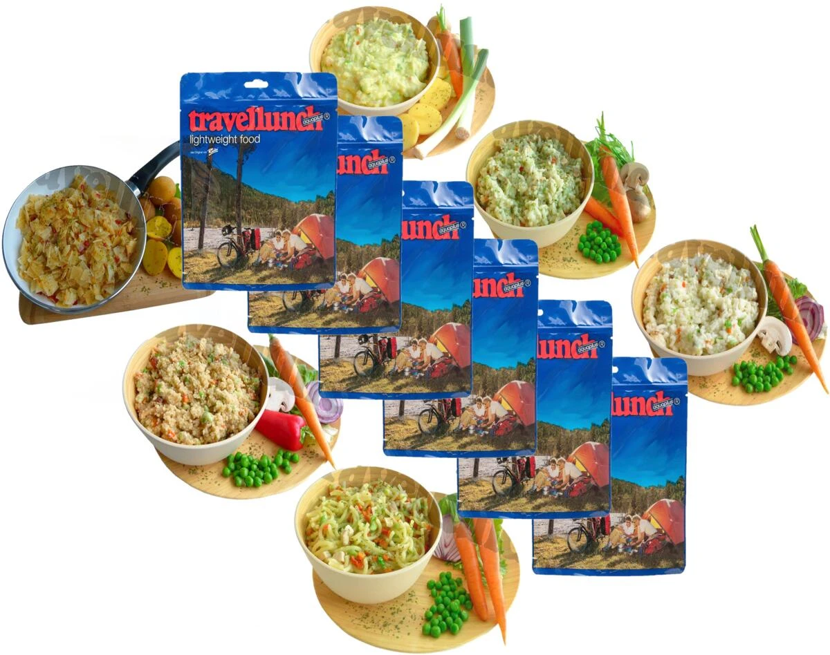 Die Firma Simpert Reiter ist mit der Marke Travellunch einer der führenden Hersteller von Outdoor- und Trekkingnahrung. Entsprechend verpackt ist diese bis zu 5 Jahre haltbar. Mit dieser schmackhaften und hochwertigen Spezialnahrung ermöglichen wir Abenteuerreisen und Expeditionen. Travellunch hat sich selbst bei härtesten körperlichen Belastungen bewährt und deckt alle Anforderungen des Tages von Frühstück bis zum Mittag- und Abendessen mit Suppen und Desserts, Snacks und Getränken ab. Alle Mahlzeiten werden in den praktischen Standbodenbeuteln geliefert. Diese ermöglichen es, Travellunch mit kochendem Wasser im Beutel anzurühren und direkt daraus zu essen. Das spart die aufwendige Reinigung von Töpfen und Tellern. Hier wird ein Sortiment von je 6 Travellunch Mahlzeiten in verschiedenen Zusammenstellungen (laktosefrei und/oder glutenfrei) angeboten. Aus guten, gefriergetrockneten Zutaten, extrem leicht und unkompliziert zu transportieren. 125 g reichen in etwa für eine Mahlzeit für eine Person, 250 g für den großen Hunger oder für zwei Personen.