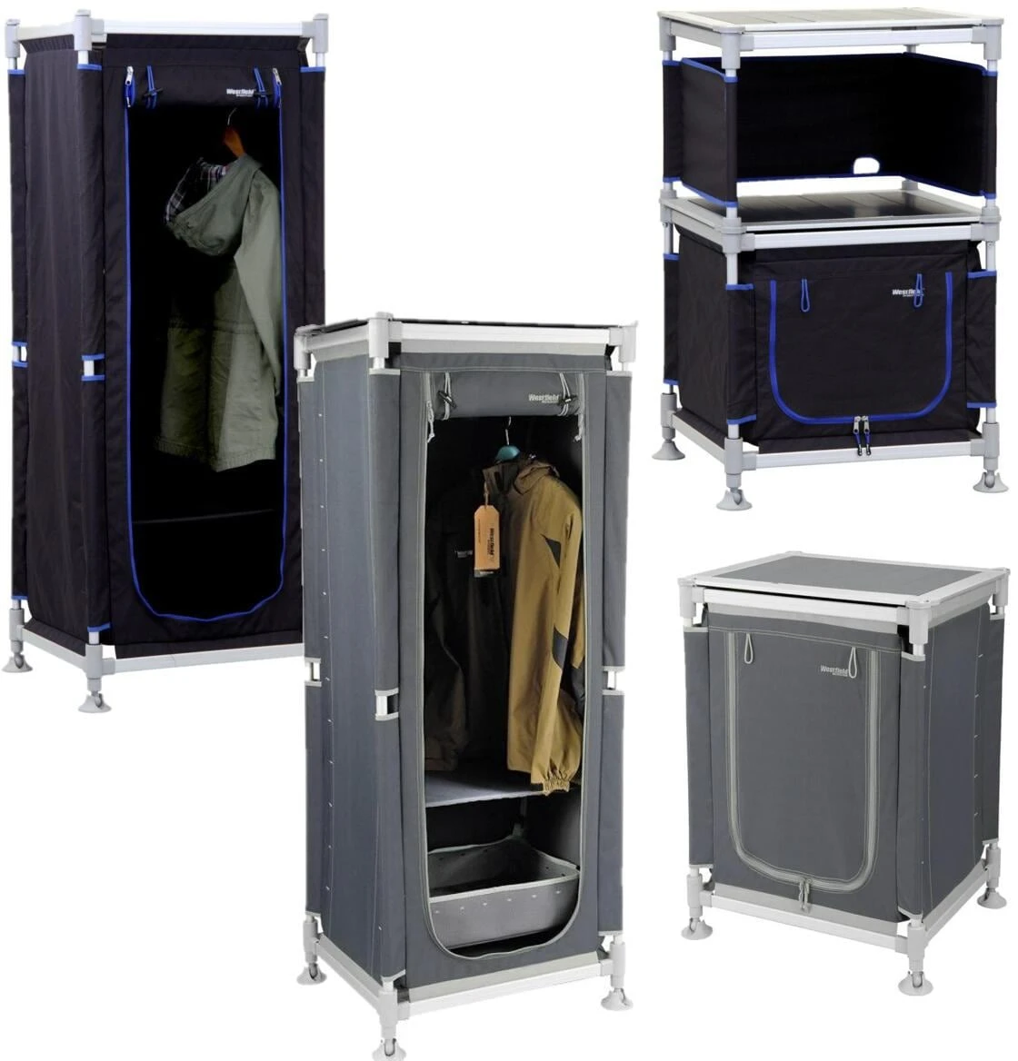 Die ModuCamp Serie besteht aus 3 Schrankmodulen und verschiedenen Erweiterungsmodulen. Die Schränke sind in beliebiger Reihenfolge mit Hilfe spezieller Verbindungselemente kombinierbar. Jeder Schrank lässt sich uneingeschränkt einzeln nutzen und kann mit jedem Erweiterungsmodul versehen werden. Der integrierte Aluminiumrahmen sorgt für hohe Stabilität des Schrankes, dadurch können an vielen Stellen Zubehörteile angebracht werden. Der Aufbau erfolgt schnell und unkompliziert dank des Aluminiumrahmens: An eingeschraubten Stangen wird der Textilkörper einfach nach oben gezogen und fixiert. Die Regalböden sind in beliebiger Position und Anzahl einsetzbar, die Standfüße höhenverstellbar.